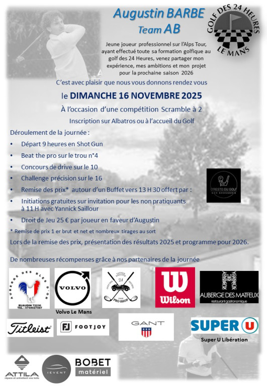 Participez à une journée spéciale en l’honneur d’Augustin Barbé, notre joueur professionnel formé ici même, au Golf des 24 Heures-Le Mans.