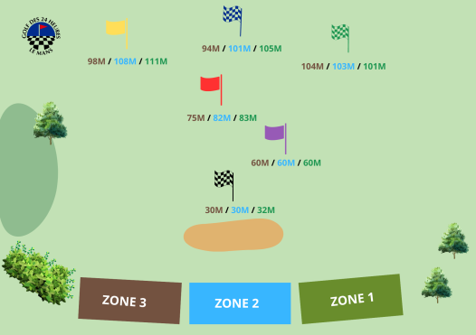 Divisé en plusieurs zones, ce practice est équipé de différentes cibles et drapeaux à des distances précises, allant de 30 à 111 mètres, permettant aux golfeurs de perfectionner leur précision et leur contrôle. Les drapeaux colorés sont disposés à des intervalles spécifiques pour aider les joueurs à visualiser et à adapter leur jeu en fonction des distances. Vous pourrez ainsi viser des cibles à 30, 60, 75, 94, 98, 104 mètres, afin d'améliorer vos coups d'approche.