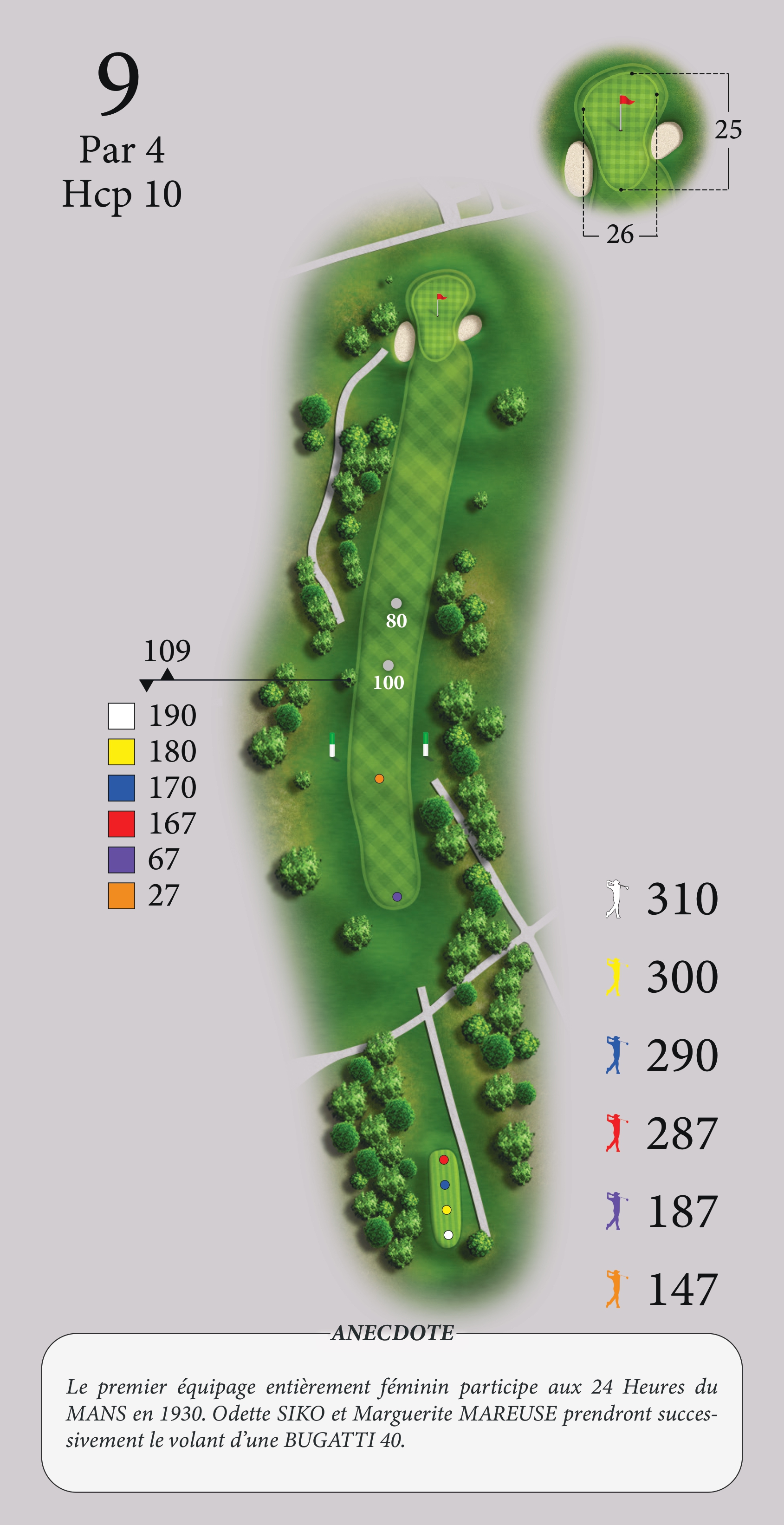 Vous pouvez driver par dessus les arbres pour les « cogneurs », sinon jouez sur la gauche du Fairway.